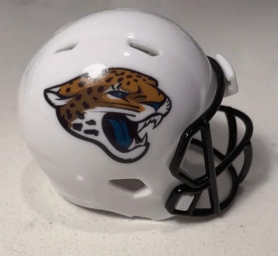 Jacksonville went back to the black helmet in 2018. This style is in the speed style. The Jaguars wore a white helmet in 2024 as an alternate. The helmet in the photo is a custom from Pick Six previews.