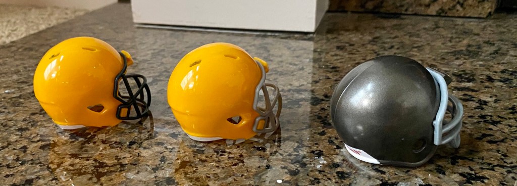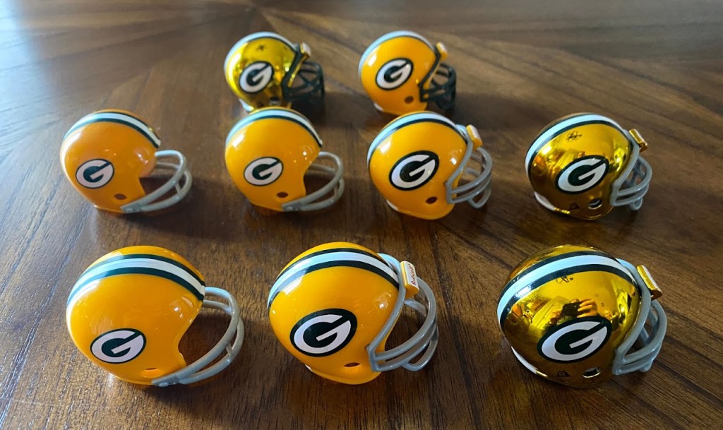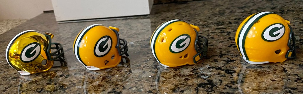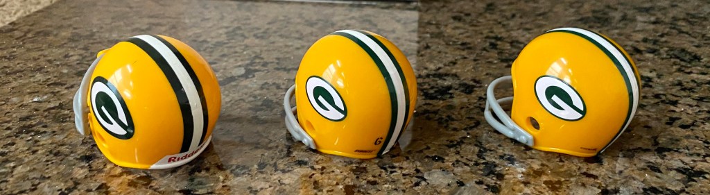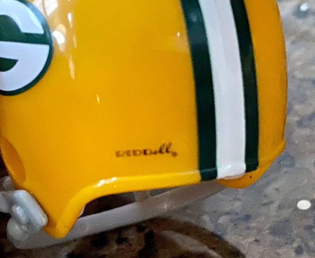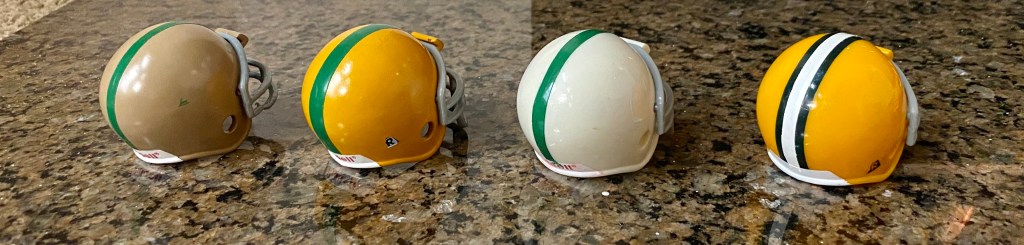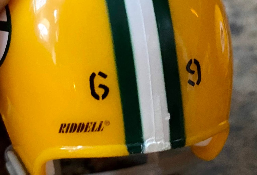 Four types of helmets predate the familiar Packers helmet with the “G” logo. Riddell did not manufacture pocket pros for these helmets. They have varying types of facemasks (see checklist at bottom).