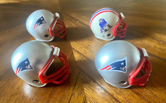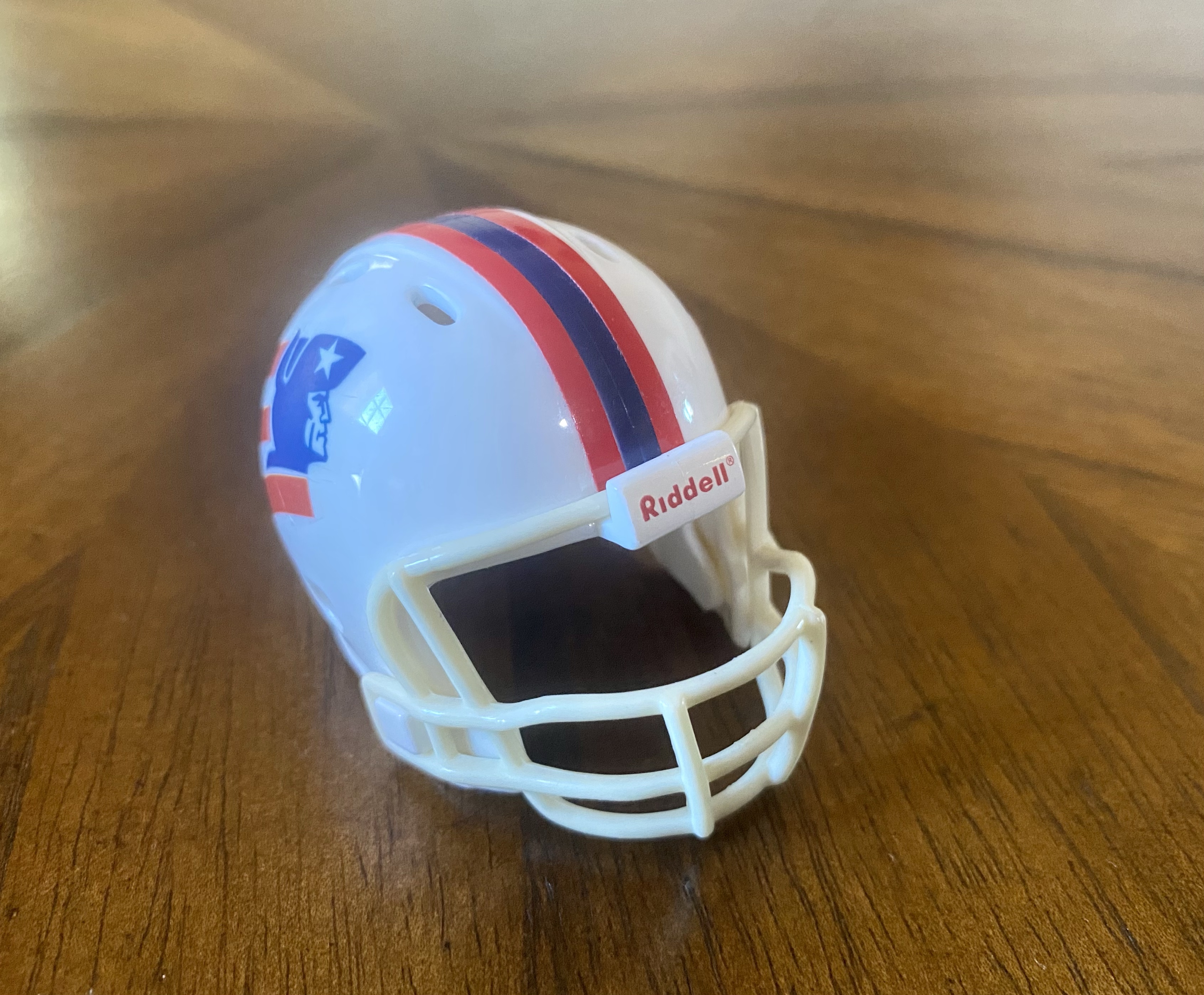 The same as the previous helmet, but with a red facemask. This helmet is in the Patriots Throwback 4-pc Team Set. The logo on the actual helmet is still enlarged, but not on the pocket helmet.