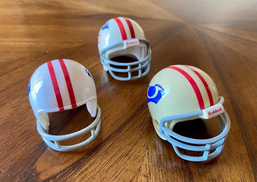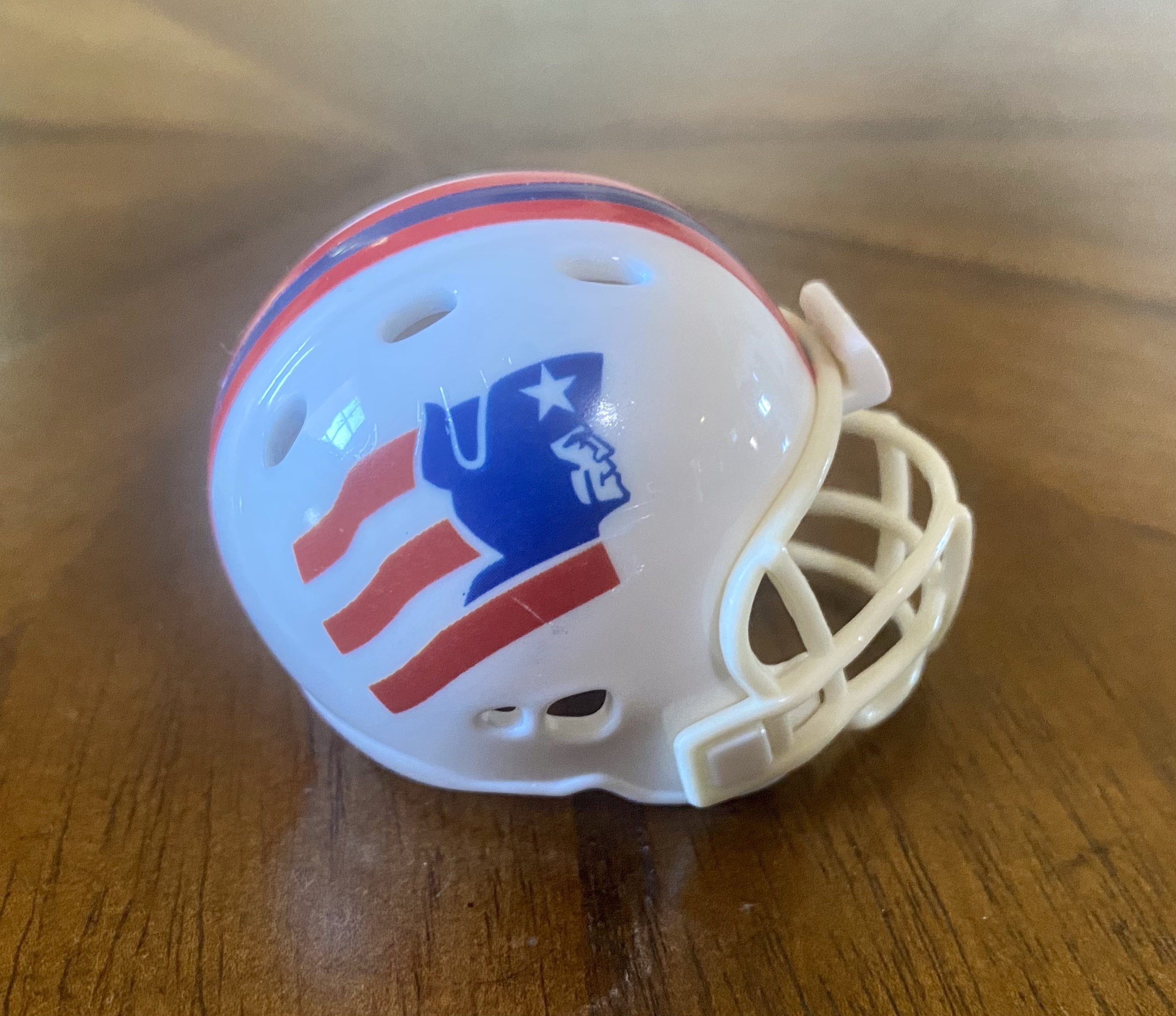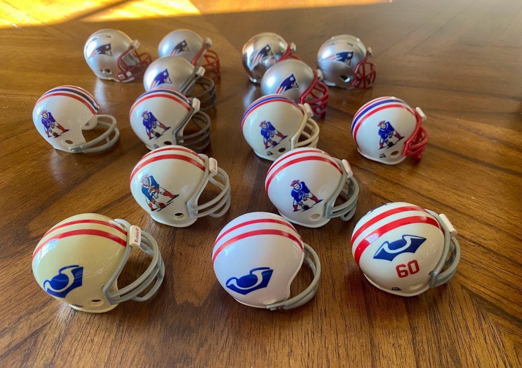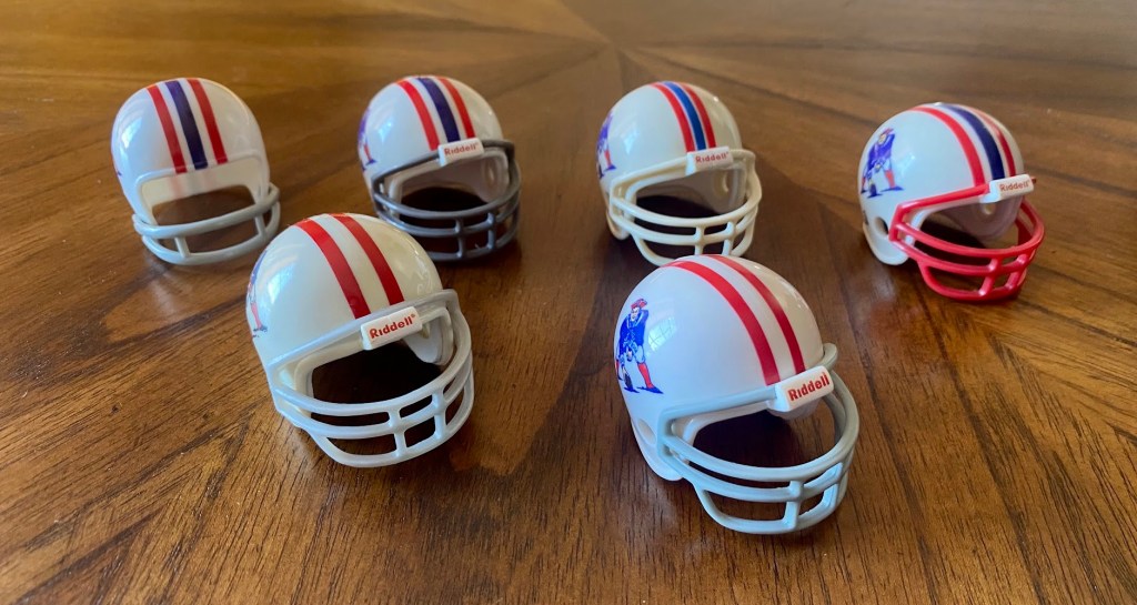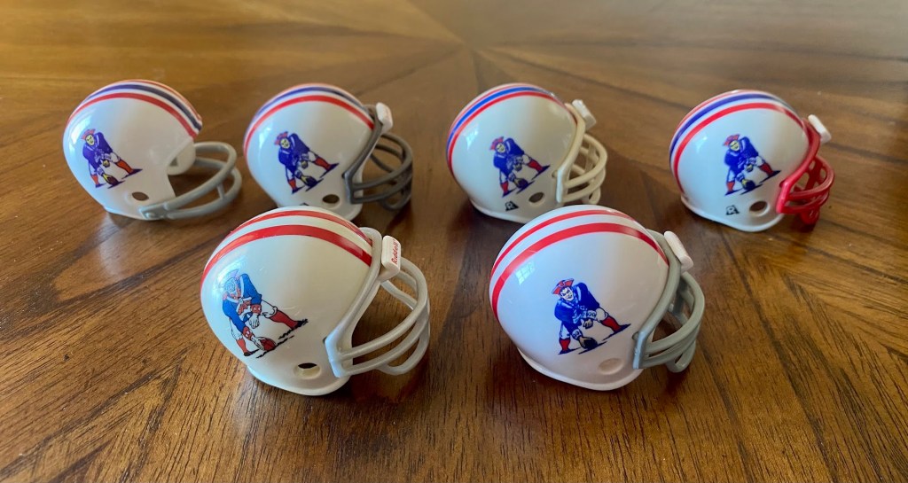 The 1961-63 helmet might have displayed a different Patriot Pat decal than appears on the pocket pro helmets. I have seen a logo that looks like Pat is drunk with a white face. I haven’t seen any evidence that ‘drunk Pat’ was on a helmet, though.