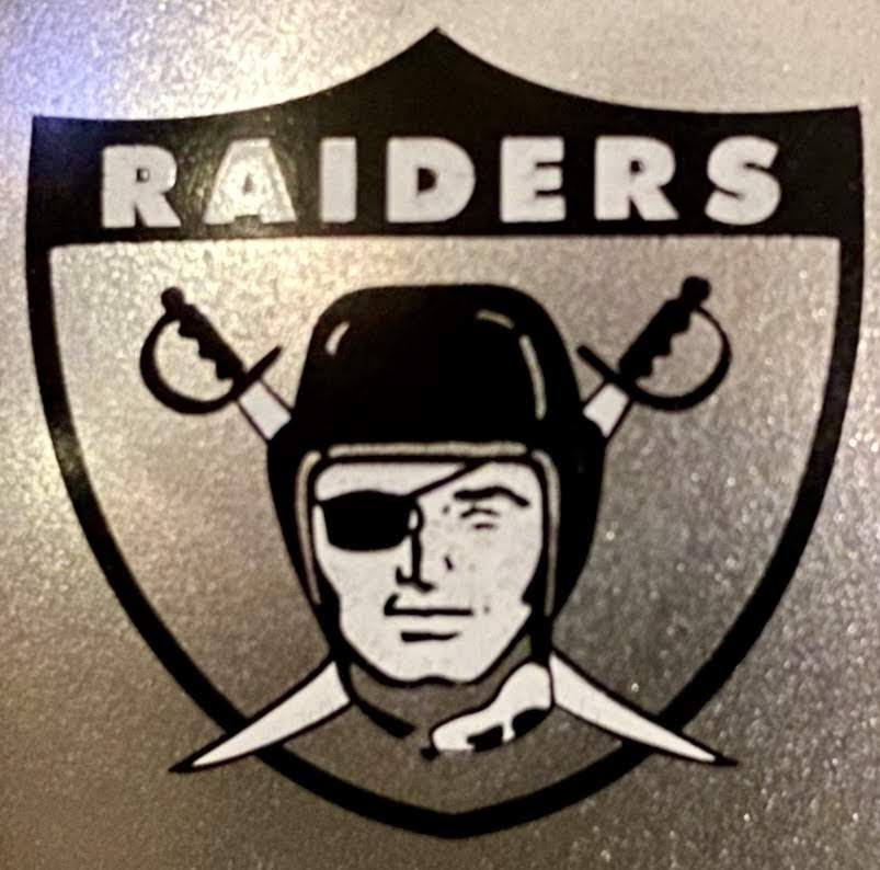 In 1964 the Raiders changed the shield from silver to black. Note the glares on the Raider helmet. This helmet is in the Throwback AFC 1969 2-bar, traditional, and chrome sets.