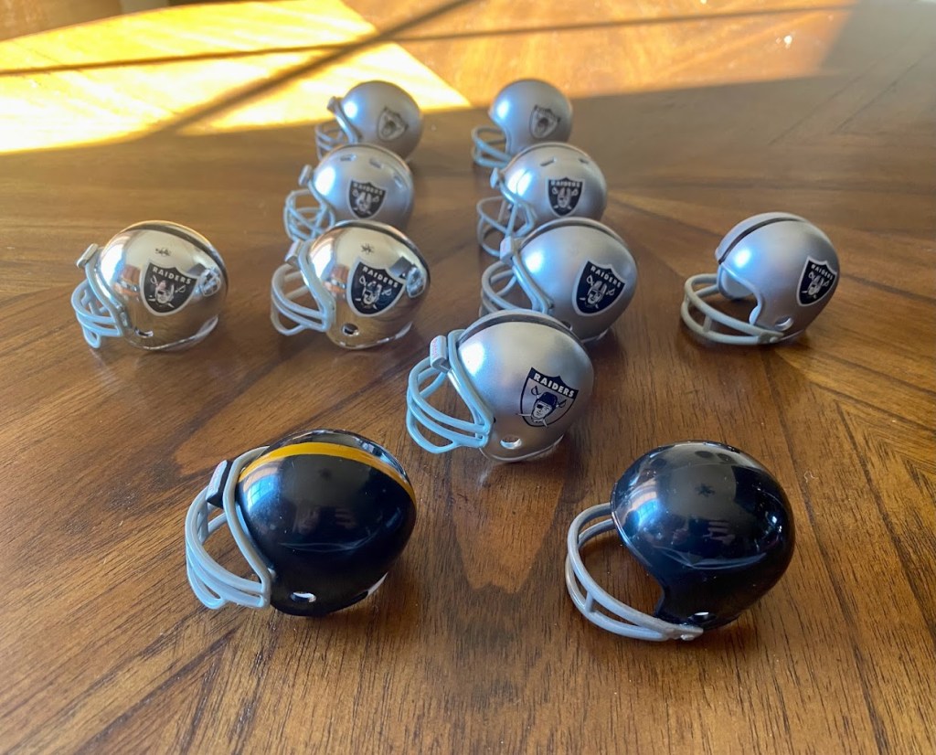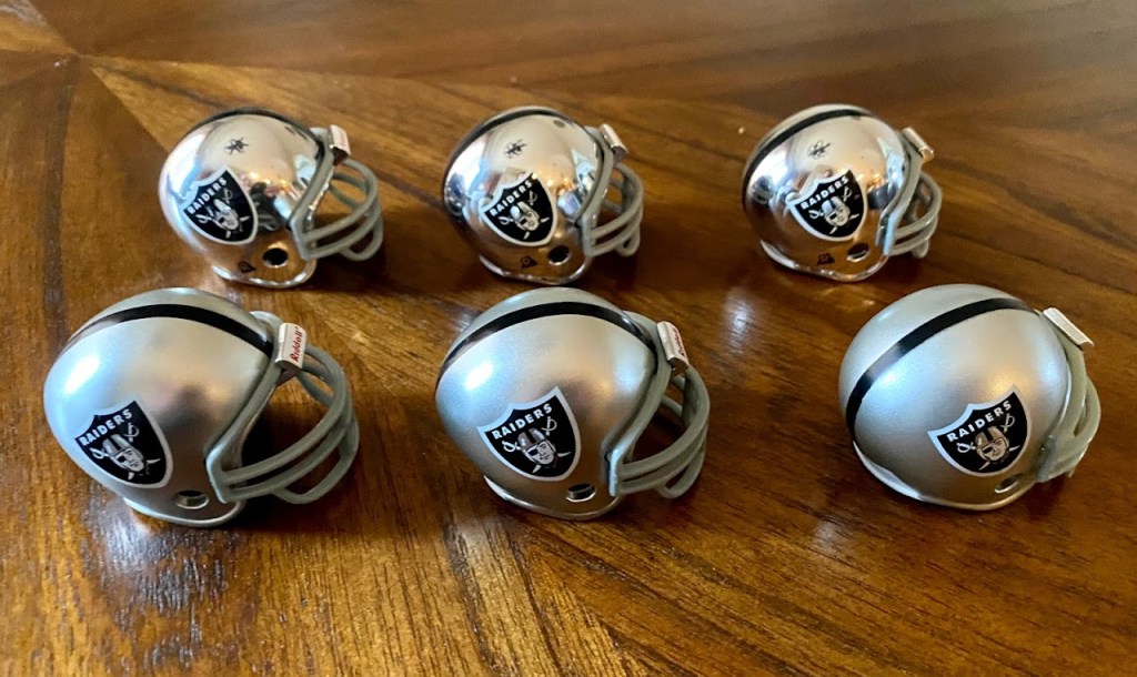 The Raiders 1960-1 helmet was plain black. The 1962 helmet added a gold stripe. There are no official pocket pro helmets for this style. The two helmets below are custom.