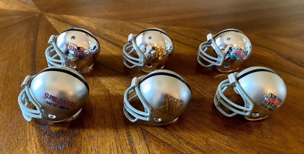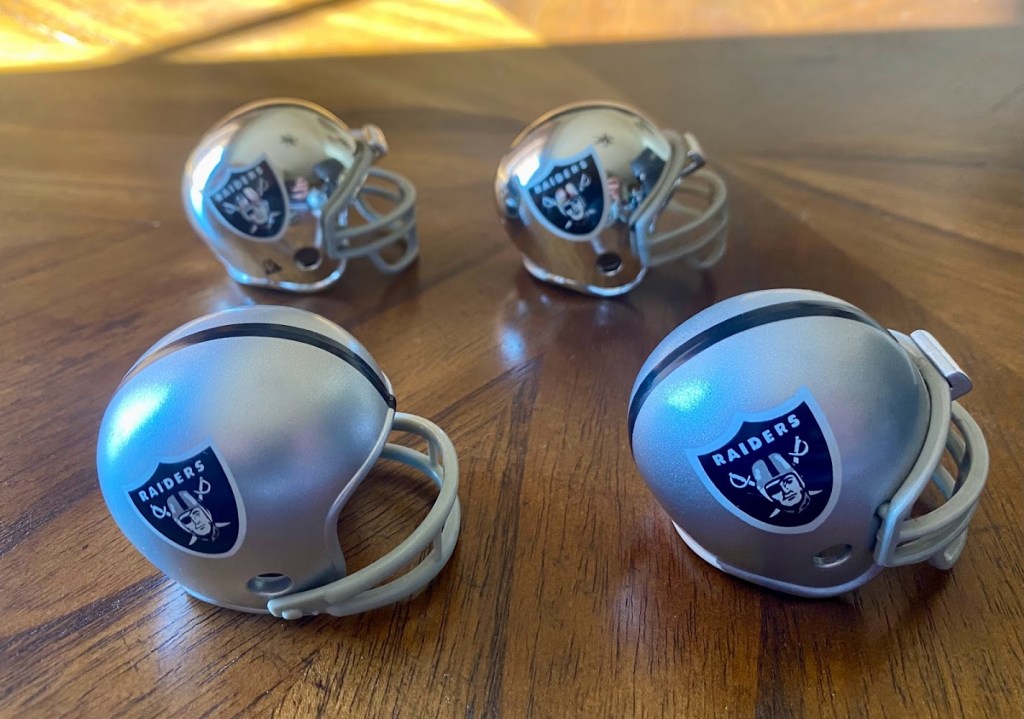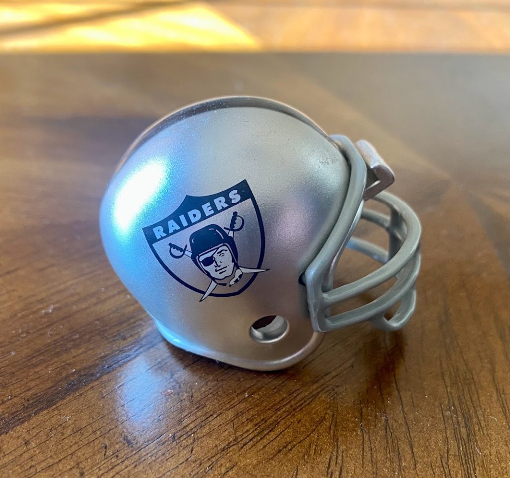 The raiders wore a silver helmet with silver shield in 1963. This helmet is in the Throwback AFL 50th Anniversary set. Also notice how the raider has a plain black helmet.