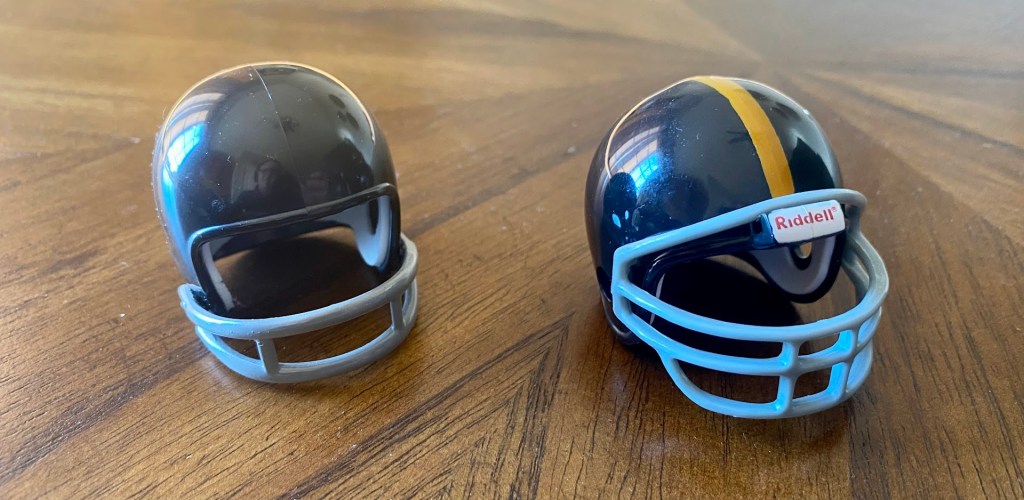 The 1994 and 2009 “throwback” helmets have a white shield, in contrast to the silver shield in the 1963 Raiders helmet. Note how the black helmet has returned, albeit in a different format and logo. These are in the Throwback Series 1, Throwback Series 2, and Throwback 2-bar sets (see photos below). Even though the helmet was worn in 1994 and 2009, Riddell made a 2-bar factory helmet, long past the 2-bar era.
