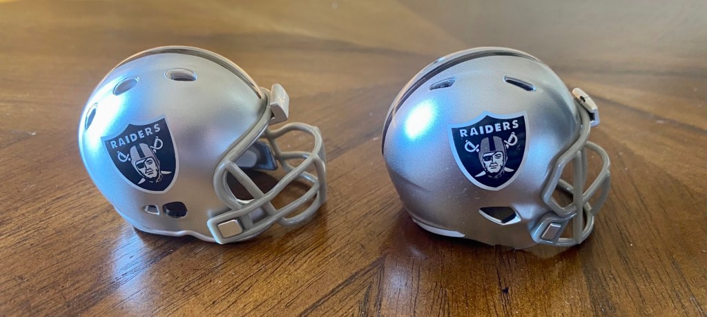In 1997, the Raiders removed the glares from the Raider’s helmet. This helmet is in the revolution and speed sets.