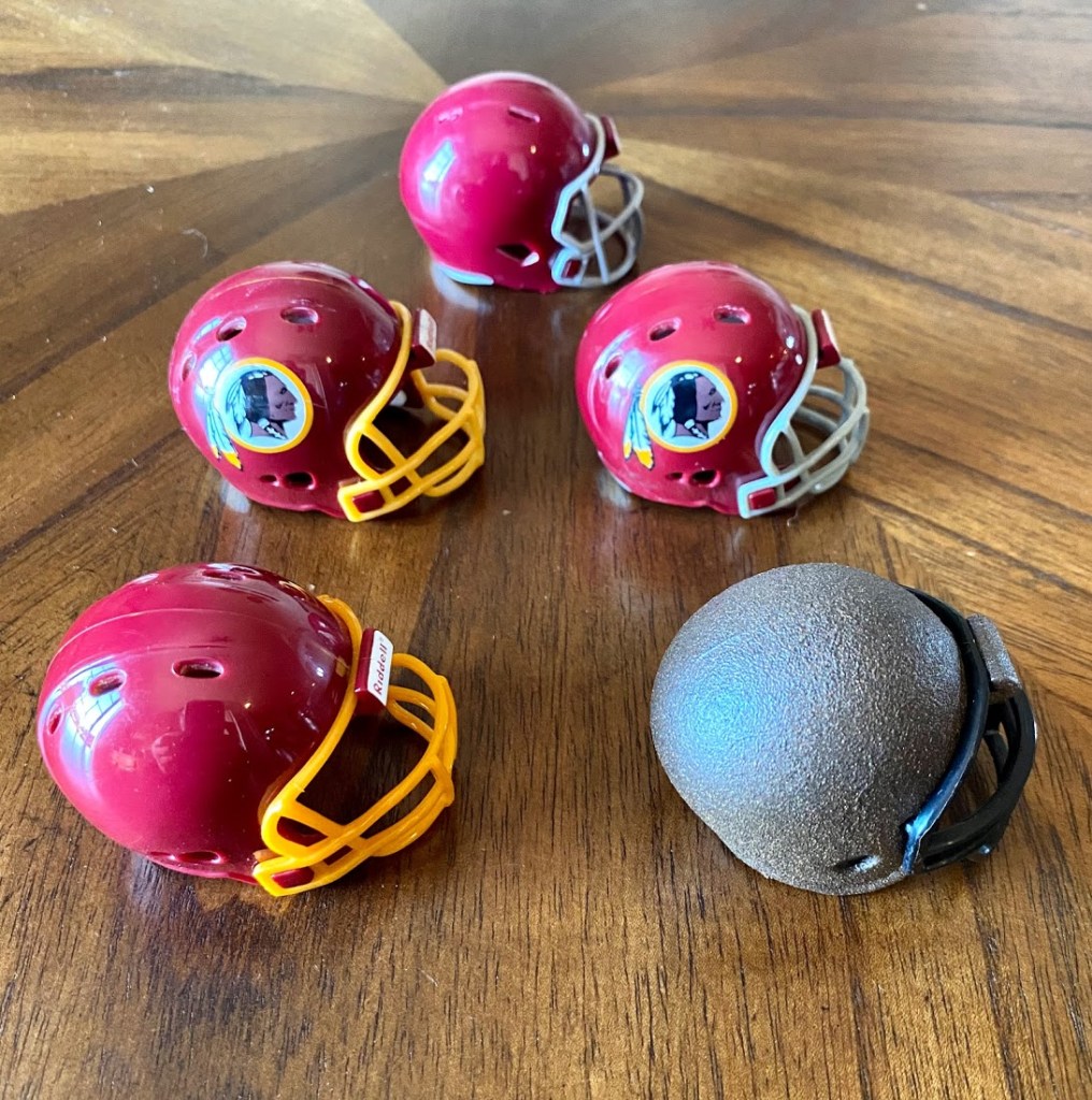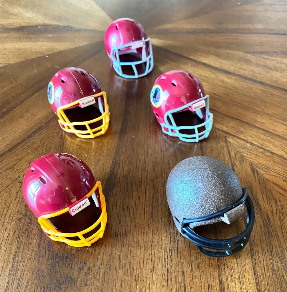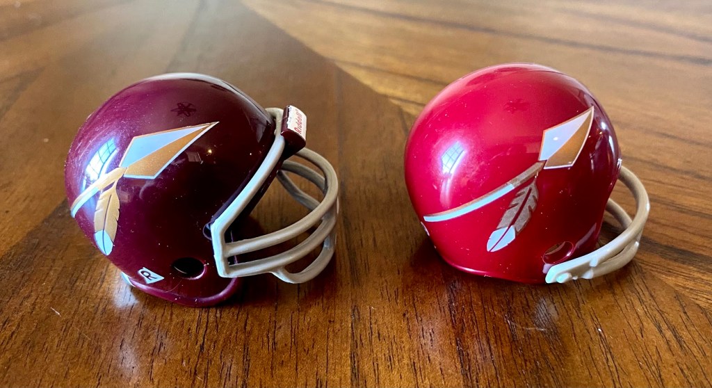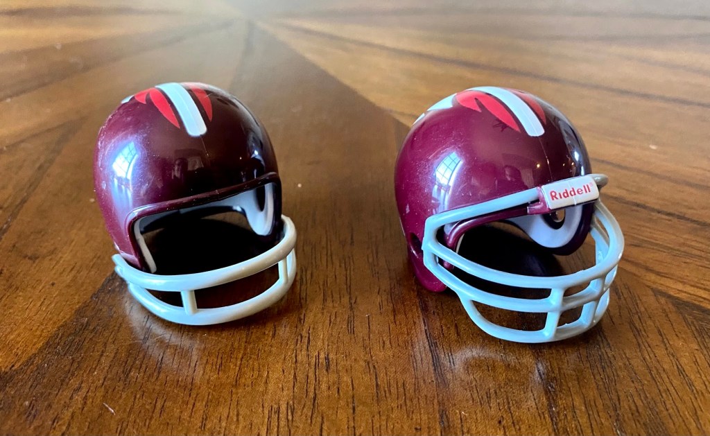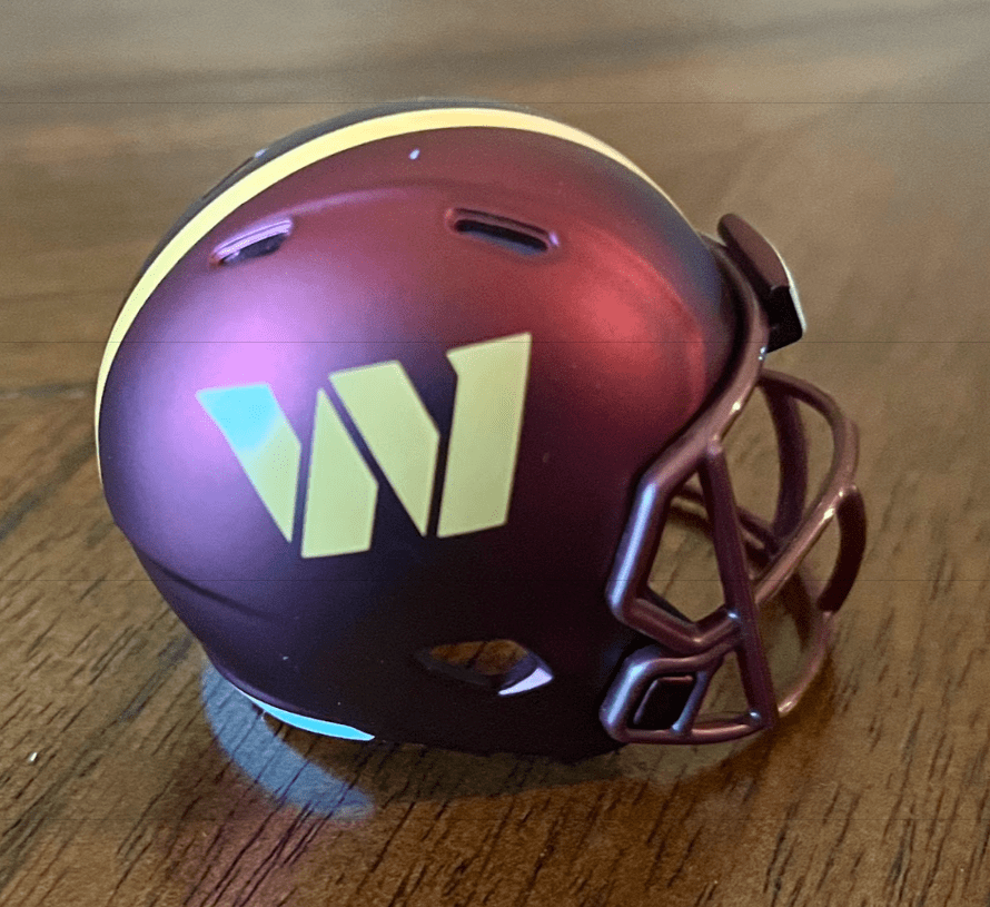 Washington updated their helmet in 2022 to reflect their new name, the Commanders. The helmet on the left is a custom alternate. The helmet is on the right is the regular helmet, which is a factory.