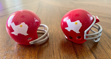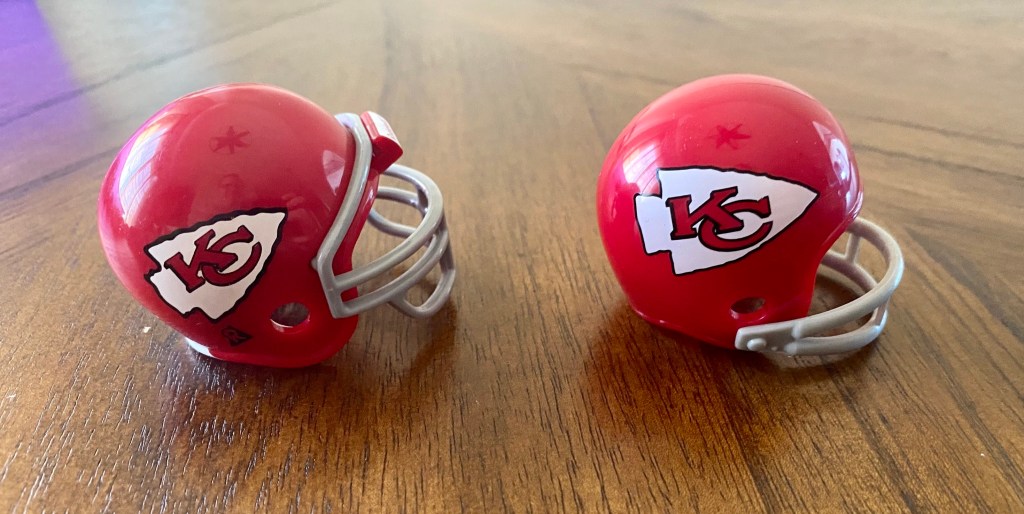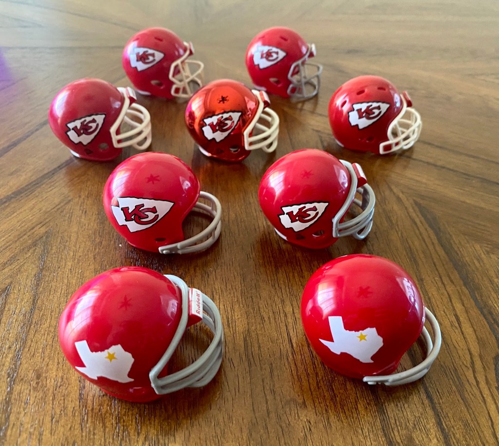 The Chiefs originated in Dallas. The Texans’ helmet is in the Throwback Series 1, Throwback AFL 50th Anniversary, and Throwback 2-bar sets.